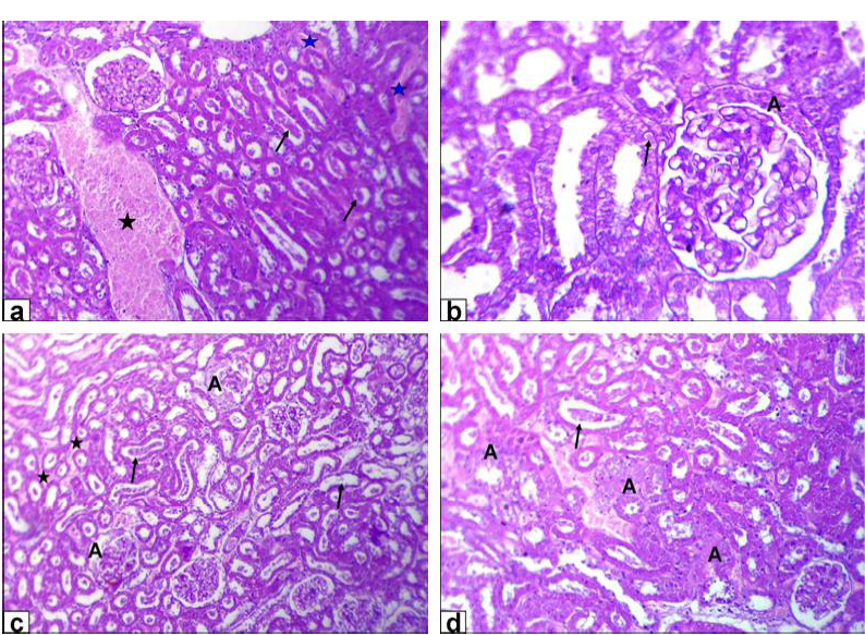 Photomicrographs of kidney sections stained with HE from: a and b) Rats treated with low dose of Lead acetate (1g/L) showing congestion of the blood vessel (black star) and inter-tubular blood capillaries (blue stars), cellular debris in the lumen of the renal tubules (arrows, X200) beside eosinophilic intranuclear inclusions in lining epithelium of renal tubules and glomerulus’s filtrate occupied the space of bowman capsule (black A, X400); c and d) Rats treated with high dose of Lead acetate (2g/L) showing tubular dilatation (arrows), haemorrhage (stars) and glomerulus’s filtrate occupied the space of bowman capsule (A, X200) in addition tubular necrosis (A) and cellular debris in the lumen of the renal tubules (arrow, X200)