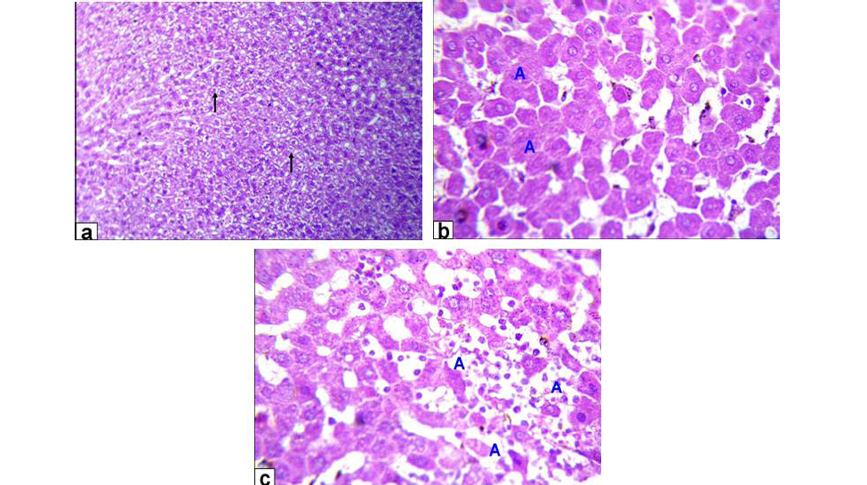 Photomicrographs of liver sections stained with HE from: a) Rats treated with low dose of Aluminium chloride (2g/L) showing moderate hydropic degeneration of the hepatocytes (arrows X200); b and c) Rats treated with high dose of Aluminium chloride (3.5g/L) showing hepatocytes necrosis with nuclei was fragmented, ghost or pyknotic and finally necrotic hepatocytes infiltrated with inflammatory cell (blue A, X 400)