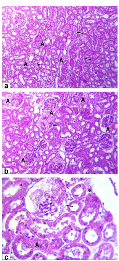 Photomicrographs of kidney sections stained with HE from rats treated with low dose of Aluminium chloride (2g/L); (a) tubular dilatation with cellular debris in its lumen (arrows) & tubular necrosis (A, X200); b) glomerulus’s filtrate occupied the space of bowman capsule (A) & necrosis of glomerulus’s tuft of bowman capsule (arrow, X200); c) necrosis of some renal tubules (A) and glomerulus’s tuft of bowman capsule (arrow, X200)