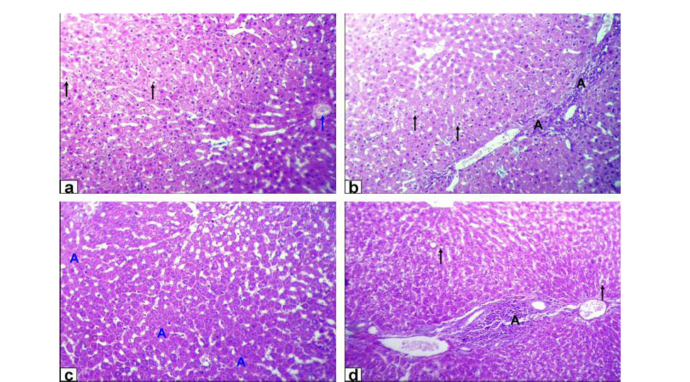 Photomicrographs of liver sections stained with HE from: a and b) Rats treated with low dose of Lead acetate (1g/L) showing hydropic degeneration of the hepatocytes (black arrows), congestion of central vein (blue arrow), loss of cord arrangement of hepatocytes and portal tract with few aggregation of mononuclear inflammatory cells (black A X200); c and d) Rats treated with high dose of Lead acetate (2g/L) showing hepatocytes focal necrosis (blue A) beside fatty degeneration (black arrows) and portal tract with massive aggregation of mononuclear inflammatory cells which scattered in different spaces (black A) with biliary hyperplasia (X200)