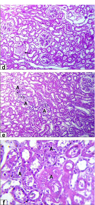 Photomicrographs of kidney sections stained with HE from rats treated with high dose of Aluminium chloride (3.5g/L) showing (d) complete necrosis of glomerulus’s tuft of bowman capsule (arrow, X200); e) interstitial nephritis with inflammatory cell infiltration (A, X200); f) tubular necrosis (A, X400)