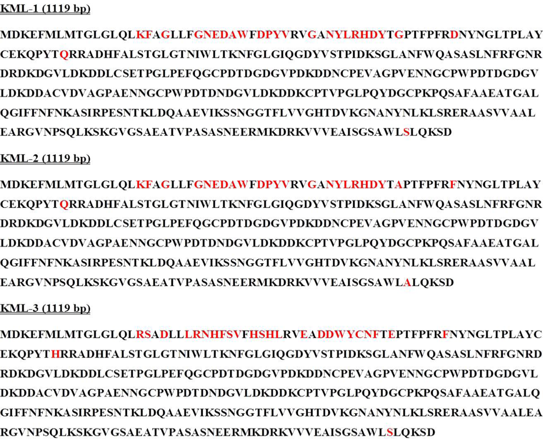 Predicted aminoacid sequences of different R. anatipestifer isolates (regions with sequence variations are shown in red colour)