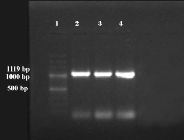 PCR amplified fragments of ompA gene of R. anatipestifer isolates: Lane 1) 100bp ladder; Lane 2) KML-1; Lane 3) KML-2; Lane 4) KML-3