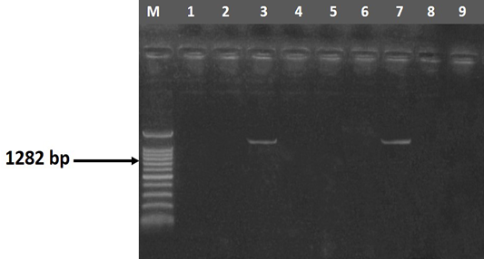 Agarose gel electrophoresis showing amplification of 1282 bp fragment using magA primer. M) DNA ladder; Lane 3 and 7) Positive samples; Lane 1, 2, 5, 6, 8 and 9) Negative samples