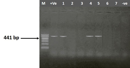 Agarose gel electrophoresis showing amplification of 441bp fragment using gyrA primer. M) 1000 bp DNA Ladder; Lane 1-7) positive samples; +Ve) Positive control; -Ve) Negative control