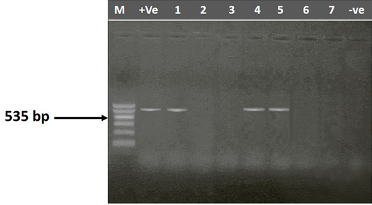 Agarose gel electrophoresis showing amplification of 535 bp fragment using rmpA primer. M) 1000 pb DNA ladder; Lane 1, 4 and 5) Positive samples; Lane 1, 2, 6 and 7) negative samples; +Ve) Positive control; -Ve) Negative control