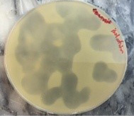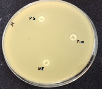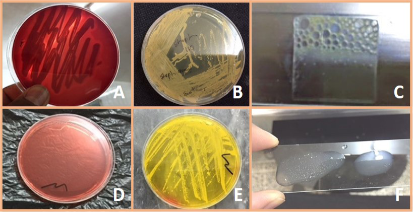 A) Staph aureus on blood agar (β – Hemolysis); B) Staph. aureus on Staph 110 agar (Creamy to yellow or orange); C) Positive catalase test; D) Mannitol salt agar without S. aureus culture; E) Fermentation of mannitol salt agar by S. aureus. (Formation of yellow color colony); F) Positive coagulase test