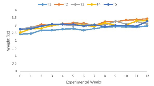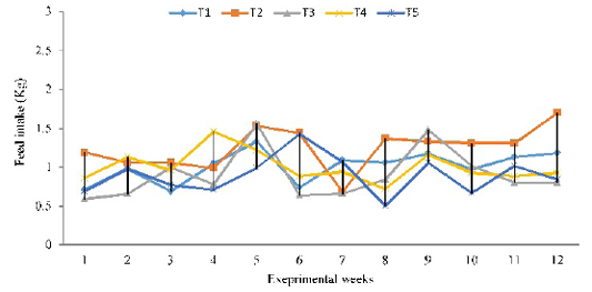 Evolution of weekly feed intake of Kabir chickens fed test diets containing graded levels of cassava-sweet potato meal as energy substitute for maize