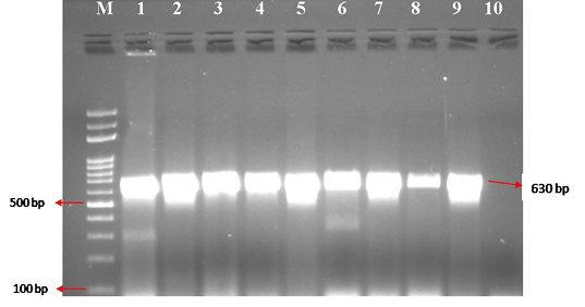 CPV specific amplicons (630 bp) by PCR using H specific primers: Lane M) 100 bp ladder; Lane 1) Positive control (CPV DNA); Lane 2-9) DNA samples isolated from faeces and blood; Lane 10) Negative control