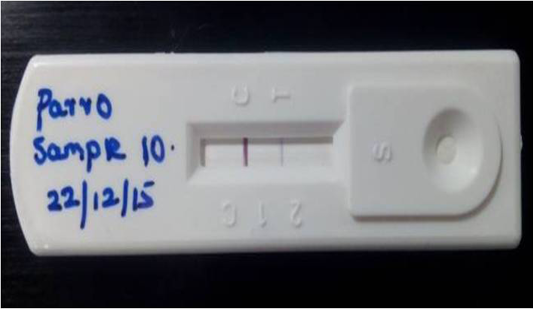 Detection of Canine parvoviral antigen in faecal sample by Lateral flow assay: T) Test line represents presence of CPV in test sample, C) band indicates Validity of the result