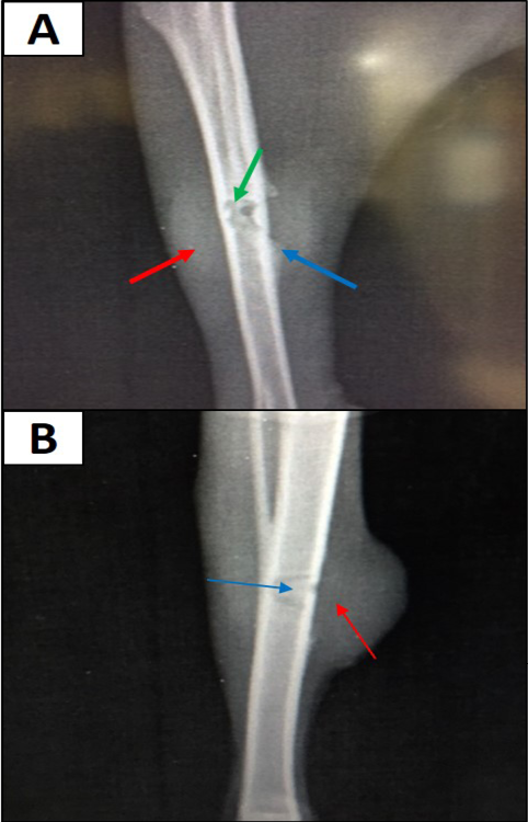 Site of operation, 7 days post treatment with Ceftaroline given intramuscularly (group D): A) Chronic Osteomyelitis (Seqeustrum still exists) (→) (ML View); B) Radiopaque area in soft tissue present represent accumulated pus (→) (AP View)