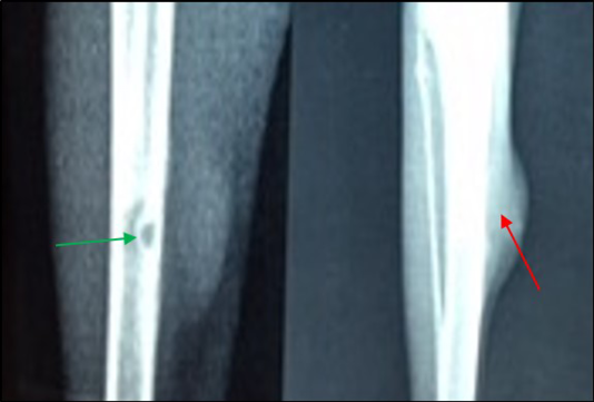 14 days post infection with MRSA, Area of bone lysis (Radiolucent spot) (→) surrounded by bone production (Radiopaque area) (→).Thickened cortex and severe periosteal reaction (→) (ML view)
