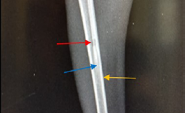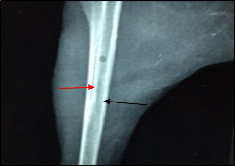 Site of operation, 14 days post treatment with Ceftaroline given intramuscularly (Group D). Still the medullary canal is not clear. Thickened cortex (→) and Endosteal reaction appeared clearly (→) (ML View)