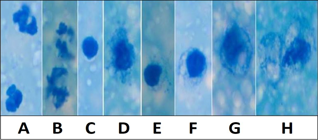 Various inflammatory and secretory cells Newman’s stain X 1000: A) Polymorphonuclear cells/ Neutrophils; B) Degenerating neutrophils; C) Lymphocytes; D and E) Macrophages with irregular cell membrane and basophilic engulfed material; F and G) Desquamated secretory glandular epithelial cells; H) Large desquamated secretory glandular epithelial cell with granulesMicroscopically milk showing occasional inflammatory cells in Newman’s stain X 200