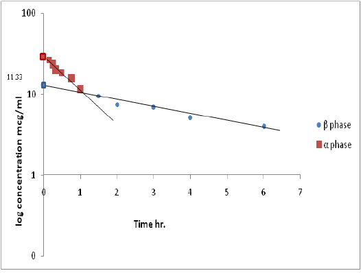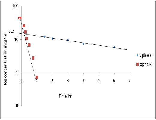 Semi-log plot of µg/ml versus time (hr) shows residual line and µg/ml late line after iv injection of ciprofloxacin with ferrous sulphate.