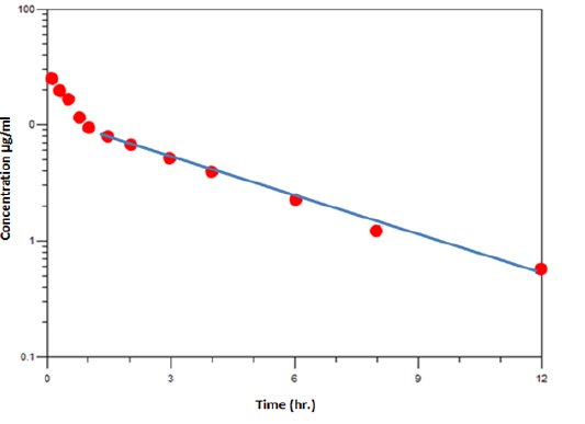 Semi-log plot of µg/ml versus time (hr) shows residual line and µg/ml late line after iv injection of ciprofloxacin.