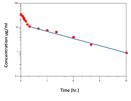 Serum ciprofloxacin concentrations (mean ± se) in 5 dogs after intravenous injection at dose (10 mg /kg b.w) with oral ferrous sulfate (100mg/ kg) given at same time