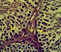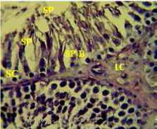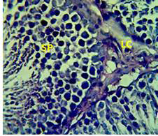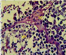 Section in the testis of animal treated with vitamin E showing proliferation of leydig cells (LC) with active complete spermatogenesis (SP). (H andE stain 40X).