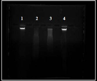 Digital printout of an agarose gel electrophoresis Showing lane (1): DNA from control sperm, lane (2) sperm DNA from atenolol treated group, lane (3) sperm DNA from atenolol plus vitamin E group, lane (4) sperm DNA from vitamin E treated group.