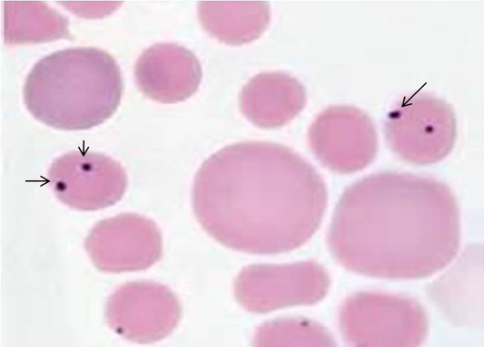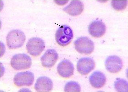 Giemsa stained blood smear showing B.gibsoni (arrow) organism