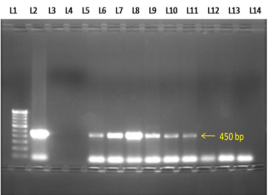 Electrophoresis gel (1.0 % agarose), showing lanes L1-100 bp DNA marker, L2- Positive control, L3- Negative control, L4- No template control, L5 to L10- Test samples showing positive PCR product of B.canis (450 bp), L11 to L13- Negative test samples.
