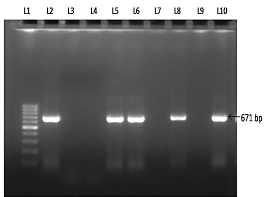 Electrophoresis gel (1.0 % agarose, stained with ethidiumbromide), showing lanes L1-100 bp DNA marker, L2- Positive control, L3- Negative control, L4- No template control,L5, L6, L8 & L10- Test samples showing positive PCR product of B.gibsoni (671 bp), L7 & L9- Negative test samples.