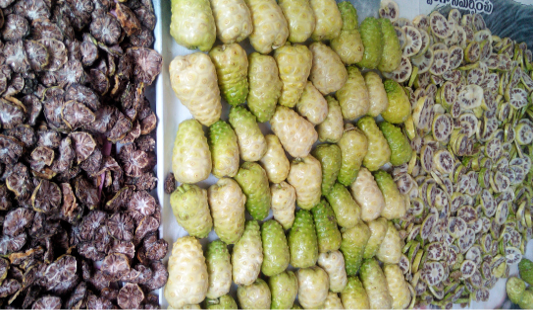 Slices (R), Raw Fruits( M), Dried Fruits (L) of Noni