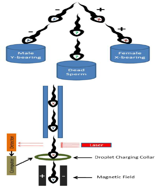 Schematic of flow cytometry to sort X bearing and Y-bearing bovine sperm cells.