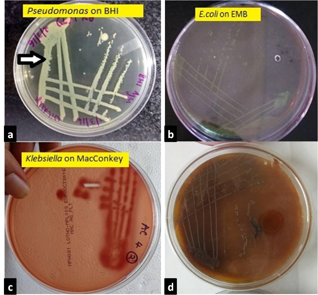 Colony Characteristics of the Isolated Bacteria. a. Pseudomonas colonies appeared greenish blue on BHI agar after 24 hr incubation; b. On EMB agar after 24hr incubation, E.coli colonies appeared as bluish black with a characteristic appearance of metallic sheen; c. On MacConkey agar after 24hr incubation, Klebsiella colonies appeared as large, pink and mucoid indicating lactose fermentation; d. On XLD agar, Blackish colonies indicating salmonella