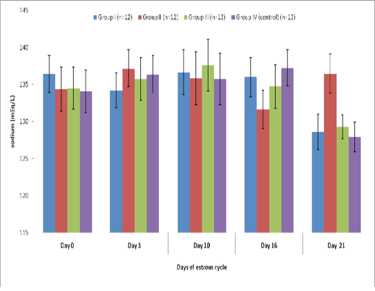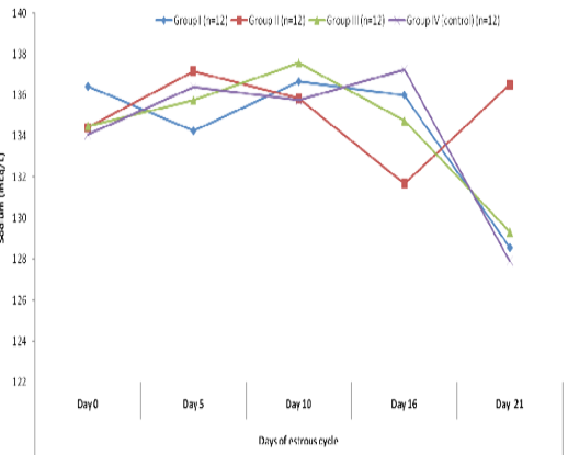 Blood concentration of sodium (mEq/L) during estrous cycle in insulin treated crossbred cows