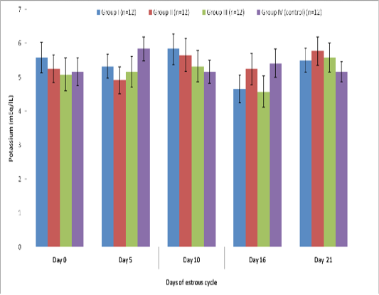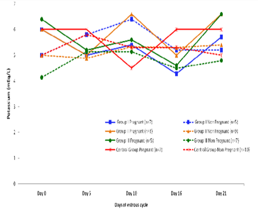 Blood conc. of potassium (mEq/L) during estrous cycle in insulin treated crossbred cows