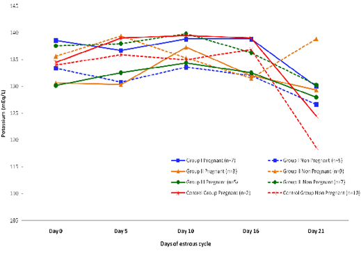 Blood concentration of potassium (mEq/L) during estrous cycle in insulin treated pregnant and non pregnant crossbred cows