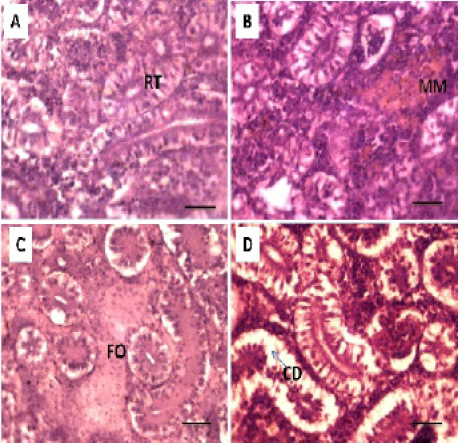 Photomicrograph showing histological structures through kidney of C.carpio exposed to different concentrations of Pb. (A): control kidney showing normal architecture of renal tubules (RT); (B & C): T1 showing hemosiderosis together with melanomacrophage aggregation (MM) with fibrous odematous (FO). (D): T2 showing cellular degeneration of renal epithelium (CD). H&E stain; Thickness 6 μm. Scale bars 50μm.