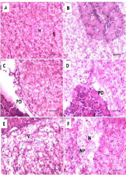 Photomicrograph showing histological structures through liver of C.carpio exposed to different concentrations of Pb. (A& B): control liver showing normal architecture of hepatic cells (H), sinusoids (S), portal vein (PV) with pancreatic tissue (P). (C&D): T1 & T3 showing patchy degeneration (PD). (E& F): T3 &T4 demonstrating cytoplasmic vocuolation (V), necrosis (N) with nuclear piknosis (NP). H&E stain; Thickness 6 μm. Scale bars 50μm.