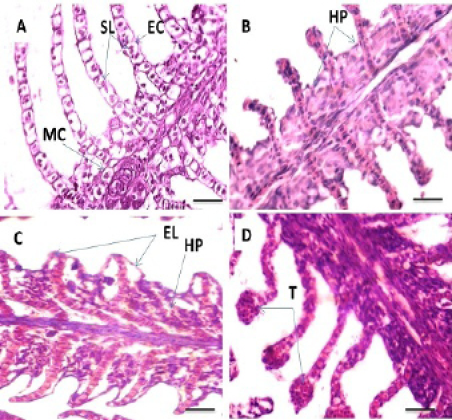 Photomicrograph showing histological structures through gillss of C.carpio exposed to different concentrations of Pb. (A): control gills showing secondary lamellae (SL), epithelial cells (EC) and mucous cells (MC). (B): T1 showing hyperplasia of the epithelial cells (HP). (C&D): T2 demonstrating hyperplasia of the epithelial cells (HP), epithelium lifting (EL) and telangiectasis (T). H&E stain; Thickness 6 μm. Scale bars 50μm.