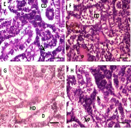 Photomicrograph showing histological structures through kidney of C.carpio exposed to different concentrations of Pb. (E & F): T3 demonstrating cellular degeneration in renal tubules (CD); dialtion of Bowmen’s space (black arrow) with deposition of protein substances in tubules (P); (G & H): T4 showing hydrobic degeneration on (HD) in the form of cytoplasmic vacuolation of the tubular epithelium, dialtion in some of renal tubules (D), necrosis (N) in the tubular epithelium with nuclear piknosis (NP) H&E stain; Thickness μm. Scale bars 50μm