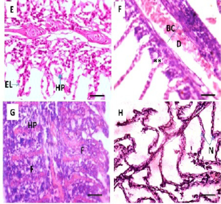 Photomicrograph showing histological structures through gillss of C.carpio exposed to different concentrations of Pb. (E): T3 showing epithelial lifting (EL), hyperplasia of the epithelium (HP). (F, G &H): T4 showing edema in the filamentary epithelium (**), dilation of the central venous (D) with blood congestion, hyperplasia of the epithelium (HP), fusion of the secondary lamellae (F) and necrosis (N) in primary and secondary lamellae. H&E stain; Thickness 6 μm. Scale bars 50μm.