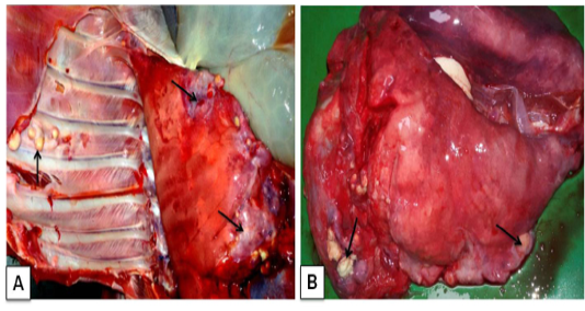 Corynebacterium pseudotuberculosis in goat: A) Caseo-calcified nodules of variable sizes in different lobes of pneumonic lungs and even in the chest wall (arrows); B)Small pea to the walnut size of abscesses with greenish pus scattered throughout the lung parenchyma (arrows)
