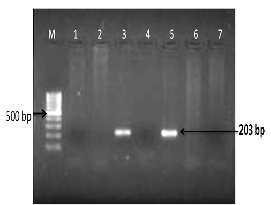Detection of Corynebacterium pseudotuberculosis DNA in affected lung and lymph node tissue samples: PCR for pld gene regions; Lanes- 3 and 5 are positive amplification (203 bp); Lanes- 1, 2, 4 and 6 are negative; Lane 7- negative control and M-100 bp ladder