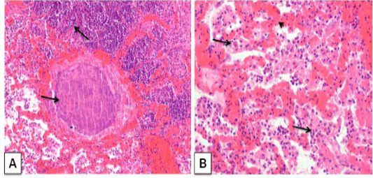 Corynebacterium pseudotuberculosis abscess in lung section of a goat. ; A) caseative necrotic mass with bacterial colonies within the lung parenchyma (arrows); H&E. (X 100) B) Lung section showing vascular congestion (arrow head), infiltration of neutrophils with macrophage in the alveoli (arrows). H&E. (X 200)