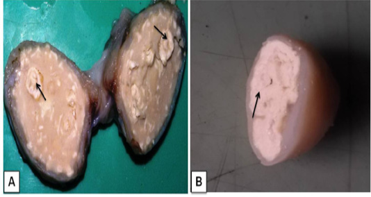 Lymphadenitis in goat. A) A cross-sectional view of affected bronchial lymph node hard calcium granules that deposited with abscesses (arrows); B) The mediastinal lymphnode showedcharacteristic lamellate (onion skin or onion ring), pathognomonic signs of CLA (arrow)