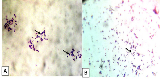 Corynebacterium pseudotuberculosis in goat: A) Bacterial culture gram’ staining showed gram positive cocco-bacilli arranged in Chinese pattern; B) Impression smear from heart also given gram positive cocco-bacilli arranged in Chinese pattern. (x1000)