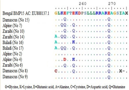 Amino acid alignment showing altered amino acid in four goat breeds under study. Does No (10Z, 6Z, 14Z, 17B, 7A, 15D and 2A) are high litter size. Does No (8D, 9D, 16B and 4A) are low litter size. Z for Zaraibi, B for Baladi, A for Alpine and D for Damascus.