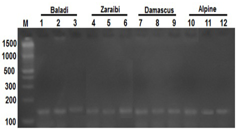 Lane 1-12 represents the PCR product of BMP15 gene (141-bp) of four goat breeds and Lane (M) is a DNA marker