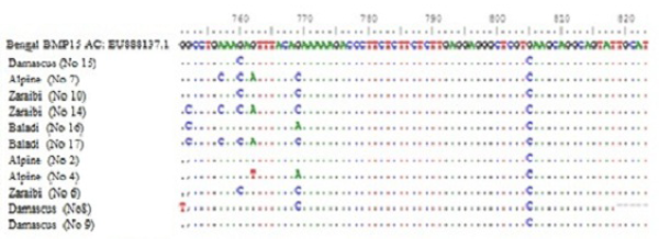 Nucleotide alignment showing SNPs in four goat breeds under study. Does No. (10Z, 6Z, 14Z, 17B, 7A, 15D and 2A) are high litter size. Does No. (8D, 9D, 16B and 4A) are lowest litter size. Z for Zaraibi, B for Baladi, A for Alpine and D for Damascus.