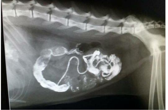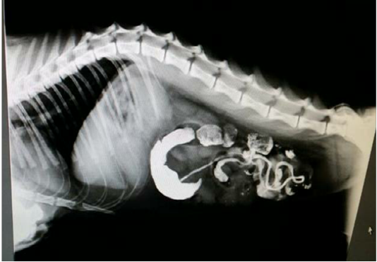 Lateral Radiograph after 33 hours of barium sulphate meal revealing accumulation of Barium in the intestinal loop and Barium has not passed into the rectum confirms intestinal obstruction