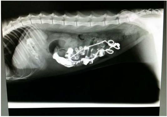 Lateral Radiograph after 12 hours of barium sulphate meal revealing pleated or plicated appearance of the intestinal loop suggestive of linear foreign body