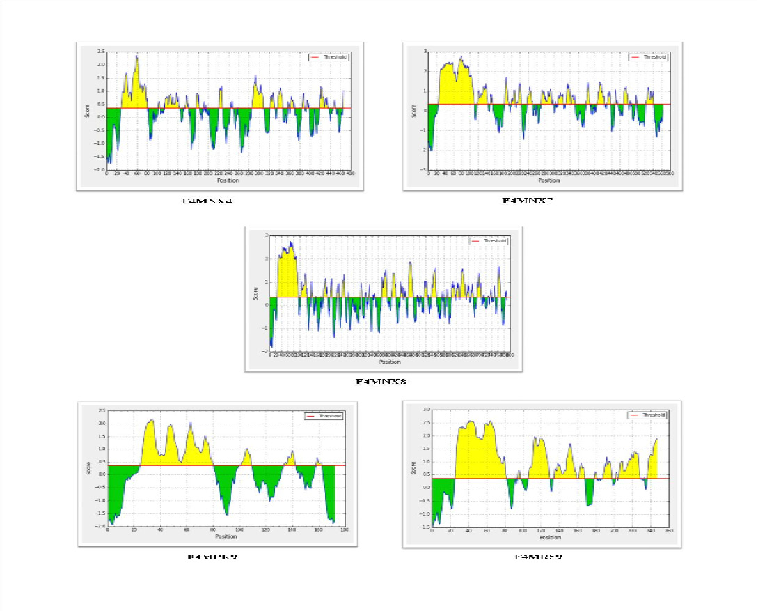 Prediction of linear B cell epitopes in the five selected lipoproteins using Bepipred server. The regions above the threshold (0.35) are antigenic, shown in yellow while, green color reflects the polypeptide regions that could not satisfy the threshold margin