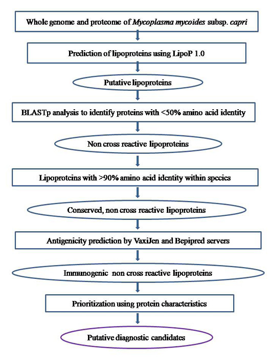 Illustration of comparative and subtractive analysis workflow to identify putative diagnostic candidates in Mycoplasma mycoides subsp. capri