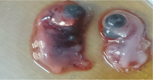 Lesion on dead embryos chicken egg 48hr after inoculated with virulent Newcastle virus (A) infected embryo (B) control